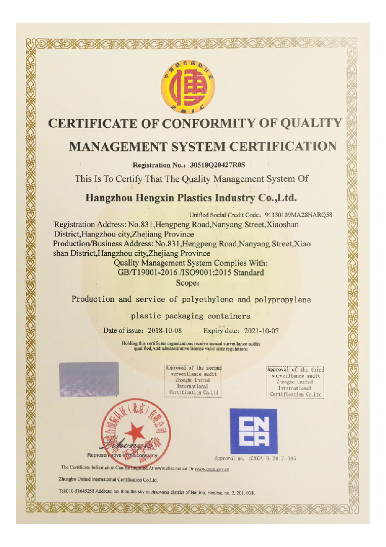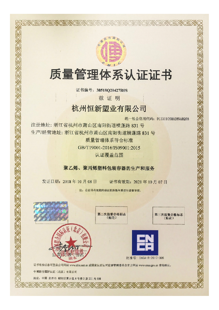 杭州恒新塑業(yè)有限公司位于美麗的西子湖畔杭州空港經(jīng)濟(jì)區(qū),公司占地面積10000多平方米,距杭州蕭山國際機(jī)場2公里,地理位置優(yōu)越,交通便捷。公司擁有先進(jìn)的生產(chǎn)設(shè)備,一流的技術(shù)人員和一整套完善的生產(chǎn)工藝管理體系標(biāo)準(zhǔn),從事企業(yè)的各項(xiàng)管理工作。專業(yè)生產(chǎn)PE(聚乙烯)、COEX(多層高阻隔)和PET (聚酯)等系列塑料制品,規(guī)格從10毫升到25升不等。公司現(xiàn)有產(chǎn)品100多種,廣泛使用于農(nóng)藥、化工醫(yī)藥、食品、五金電子、機(jī)電等領(lǐng)域。同時(shí),可根據(jù)客戶的不同需求 ,經(jīng)專業(yè)化的“量身定制”,提供性價(jià)比更佳的產(chǎn)品和服務(wù)。